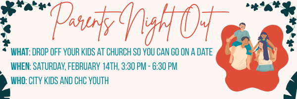 - February 14th, 3:30 pm Parent’s Night Out
